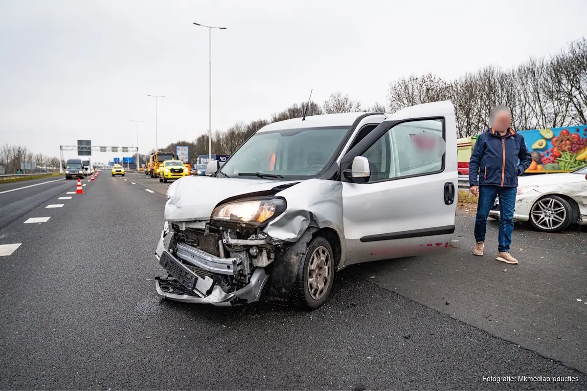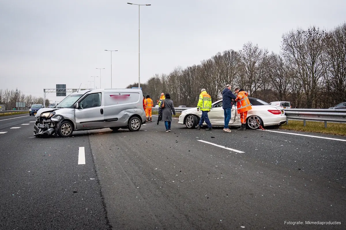 De inzittenden van de personenauto kwamen met de schrik vrij. De bestuurder van de bedrijfswagen is voor controle overgebracht naar het ziekenhuis. Beide voertuigen en de geleiderail raakten beschadigd. De voertuigen zijn door een berger afgesleept. Het is nog onbekend hoe lang de rijstroken afgesloten blijven.