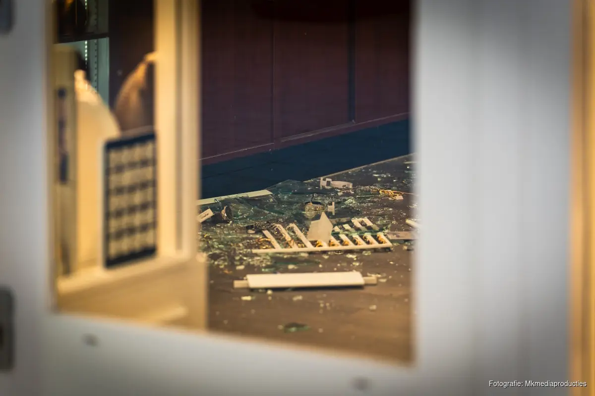 De politie is op zoek naar twee jonge mannen, donker gekleed en met mondkapje, die met onbekende buit via de parkeergarage zijn gevlucht. Tijdens de overval werd de etalage ingeslagen; de glasscherven liggen verspreid over de grond en worden na onderzoek opgeruimd.