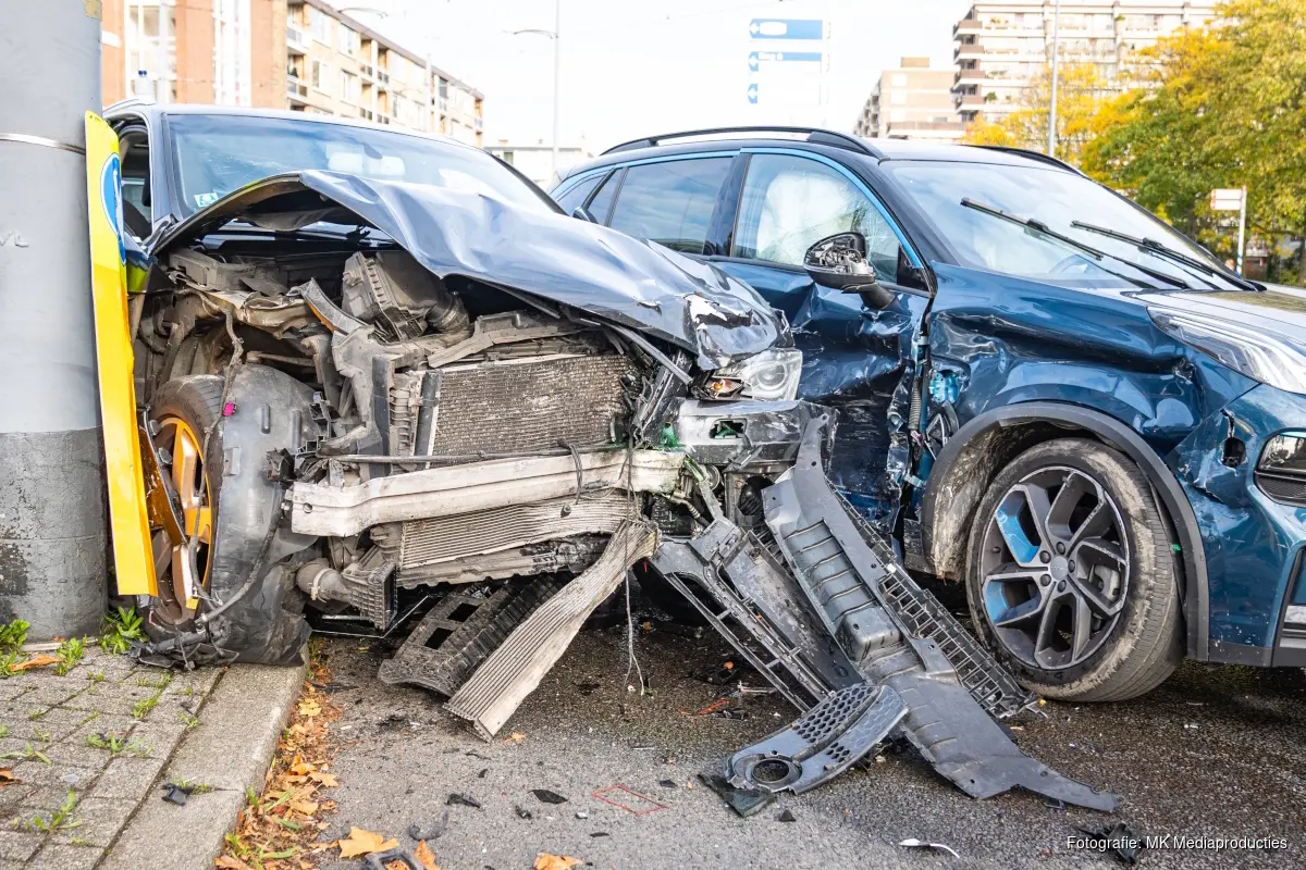 ROTTERDAM - Op de kruising van de Spinozaweg met de Pascalweg hebben twee auto's een aanrijding gehad. Ze eindigde tegen elkaar aan en één van de auto's kwam tot stilstand tegen een lantaarnpaal.