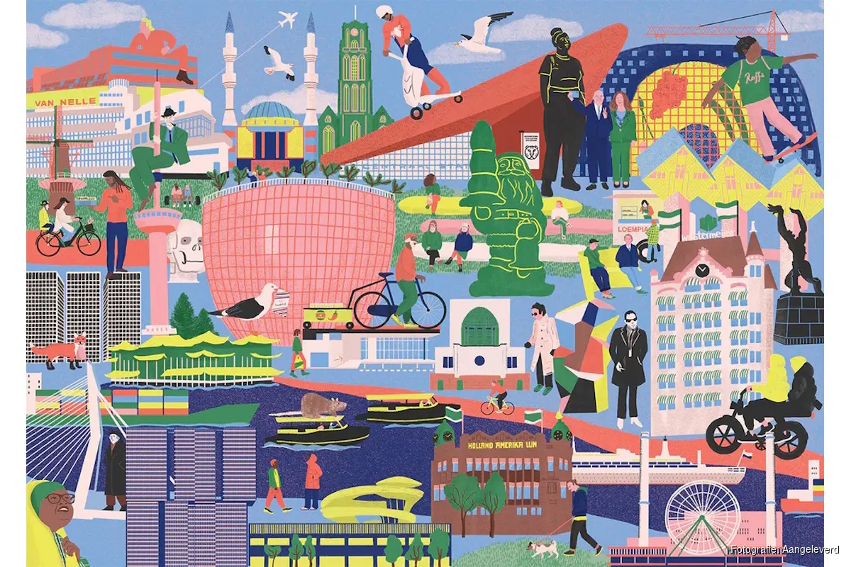 Naast de iconische architectuur brengt de illustratie ook het echte Rotterdam tot leven: een internationale en gelaagde gemeenschap, herkenbare lokale figuren en verrassende kunst in de publieke ruimte. Samen vormen ze het verhaal van een stad die zichzelf telkens opnieuw uitvindt en blijft bouwen aan haar toekomst.